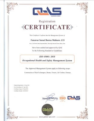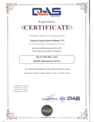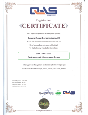 این گواهینامه نشان‌ دهنده‌ی استقرار و اجرای سیستم مدیریت زیست‌ محیطی در فرآیندهای طراحی و ساخت تجهیزات صنعتی شامل مبدل‌های حرارتی، درام‌ها، برج‌ها، خنک‌کننده‌های هوایی و کوره‌ها می‌باشد.